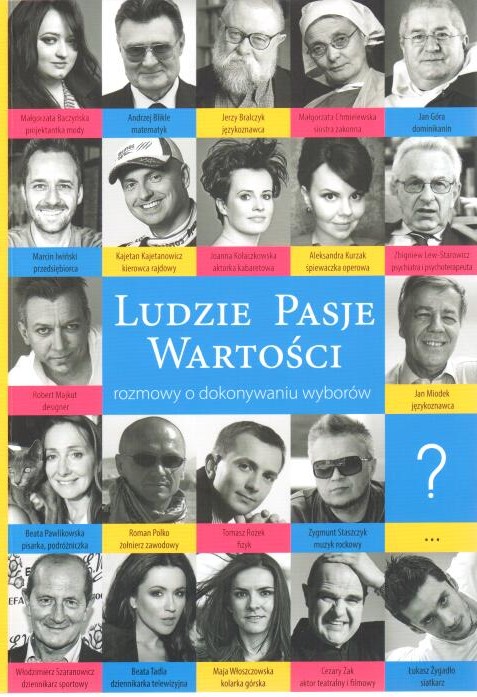 "Ludzie Pasje Wartości - rozmowy o dokonywaniu wyborów” to edukacyjno-wychowawczy projekt wydawniczy przedstawiający 21 niezwykle ciekawych historii ludzi nauki, kultury, sportu, biznesu i powołania. Bohaterowie opowiadają o życiowych wyborach, których częstokroć dokonywali już w wieku 16-19 lat, o wartościach, jakimi się kierowali, oraz o tym, jaki wpływ na ich decyzje miały szkoła, rodzina i środowisko. Publikacja przeznaczona jest dla młodych ludzi dokonujących wyboru zarówno kolejnej szkoły, jak i drogi zawodowej. [lubimyczytać.pl]