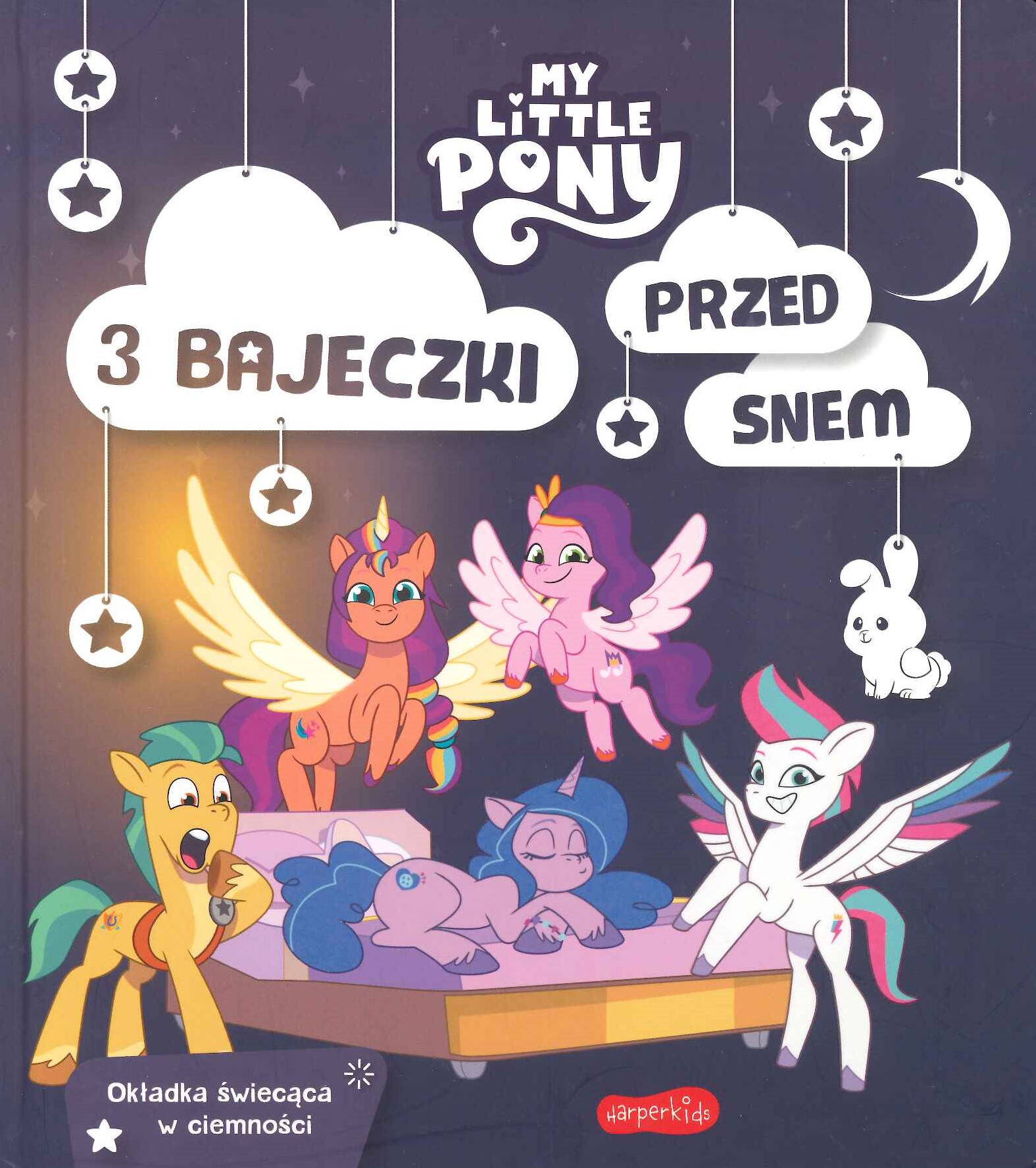 My Little Pony. 3 bajeczki przed snem to idealna książeczka dla maluszka. Została wydana w okładce świecącej w ciemności, aby rytuał codziennego czytania z dzieckiem stał się jeszcze bardziej wyjątkowy. Książka ma bezpieczne, zaokrąglone rogi, a w środku znalazły się urocze, niepublikowane dotąd opowieści o przygodach Sunny Starscout i jej przyjaciół. Przenieś się do Zatoki Grzyw i dołącz do swych ulubionych bohaterów – Sunny Starscout oraz pozostałych kucyków. Przeczytaj o wyjątkowej szkole latania, przekonaj się, kto wcieli się tam w rolę nauczycielki i czy jeden dzień zajęć wystarczy, aby zamienić grupkę początkujących lotników w podniebnych akrobatów. Dotrzymaj towarzystwa Sunny i Izzy podczas ich górskiej eskapady i odkryj tajemnicę zaginionych okularów słonecznych Zipp. Te trzy proste, ciepłe i pełne humoru opowieści ze świata kucyków ukołyszą malucha do snu, a świecąca w ciemności okładka sprawi, że rytuał wspólnej wieczornej lektury nabierze wyjątkowej aury! Aby podziwiać efekt świecenia, wystarczy naświetlić okładkę książki pod lampą lub zostawić ją na chwilę w jasnym pomieszczeniu. Lakier użyty na okładce jest w pełni bezpieczny dla dzieci, a dzięki zaokrąglonym rogom książka nadaje się nawet dla kilkulatków. W zbiorze znalazły się niepublikowane wcześniej opowieści napisane na podstawie odcinków serialu „MLP. Opowiedz swoją historię”: „Górska kolacja”, „Szkoła latania” i „Skradzione okulary”.